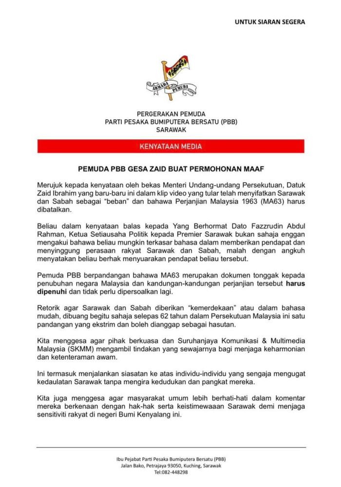 KUCHING: Pergerakan Pemuda Parti Pesaka Bumiputera Bersatu (PBB) mendesak bekas Menteri Undang-Undang, Datuk Zaid Ibrahim, untuk membuat permohonan maaf secara terbuka kepada rakyat Sarawak dan Sabah susulan kenyataannya yang menyifatkan kedua-dua wilayah itu sebagai “beban” serta mencadangkan agar Perjanjian Malaysia 1963 (MA63) dibatalkan.