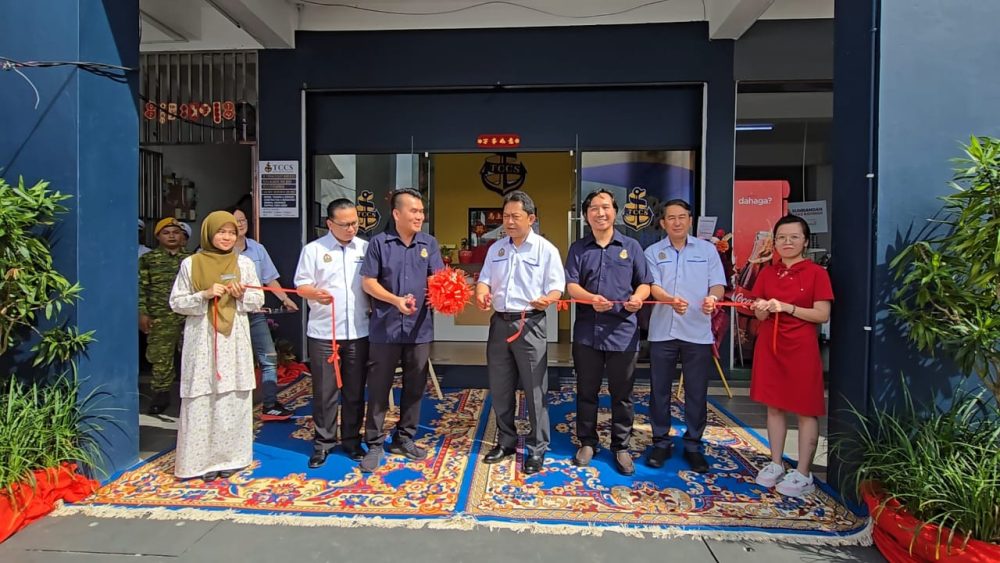 PERASMIAN…Dickson menyempurnakan majlis pembukaan rasmi Institut Latihan TCCS Marine Sdn Bhd. Turut disaksikan oleh James (tiga kiri).