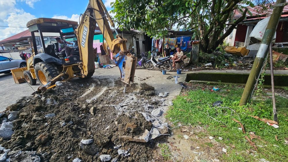 KEADAAN permukaan Jalan Ketitir sedang dibaiki secara sementara oleh kontraktor serta pihak Majlis Perbandaran Padawan (MPP) bagi memastikan keselamatan pengguna jalan raya sementara menunggu siapnya pembinaan jalan baharu di kawasan berkenaan. Foto Kaunselor Gerald Goh Teck Joo