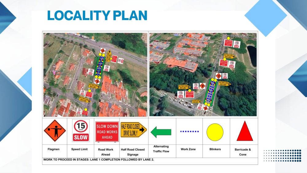 Sehubungan itu, pengguna jalan raya dinasihatkan supaya memperlahankan kenderaan, mematuhi had laju yang ditetapkan iaitu 15 kilometer sejam serta sentiasa mengikuti arahan pengawal bendera dan papan tanda arah yang dipasang di kawasan terlibat.