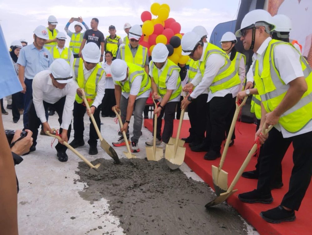 TIMBALAN Menteri Infrastruktur dan Pembangunan Pelabuhan Sarawak, Datuk Ir Aidel Lariwoo, melaksanakan gimik simbolik Sentuhan Terakhir sempena lawatan terakhir ke tapak Projek Pembinaan Jambatan Batang Lupar No.1 di Kampung Beliong, Sebuyau, yang dijangka dibuka kepada orang awam sebelum sambutan Perayaan Gawai tahun ini. Foto Ukas.