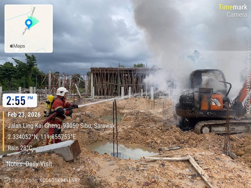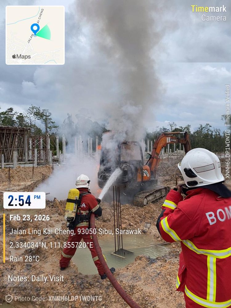 SIBU: Sebuah jengkaut musnah sepenuhnya dalam kebakaran di persimpangan lampu isyarat Ulu Sungai Merah di sini, petang tadi.