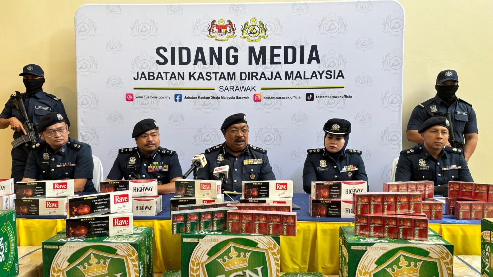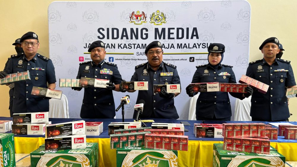 SIBU: Jabatan Kastam Diraja Malaysia (JKDM) Sibu berjaya menyita 8.33 juta batang rokok dan minuman keras tanpa cukai dengan nilai keseluruhan sitaan berjumlah RM6.32 juta dalam satu serbuan di sebuah rumah kediaman di Brooke Drive, di sini.