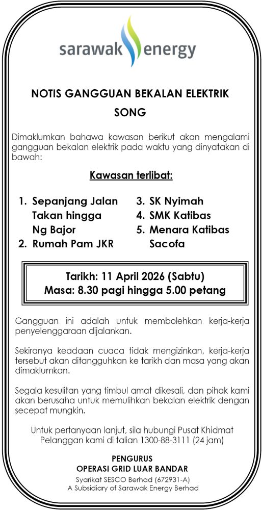 IKLAN Jumaat, 10-11 April 2026, SEB Notis Gangguan Bekalan Elektrik Song Utusan Sarawak 5 hours ago Continue Reading Previous: Jumaat, 10-11 April 2026, SEB Notis Gangguan Bekalan Elektrik Sibu (Lrg Brother Albinus)Next: Jumaat, 10-11 April 2026, SEB Notis Gangguan Bekalan Elektrik Sarikei