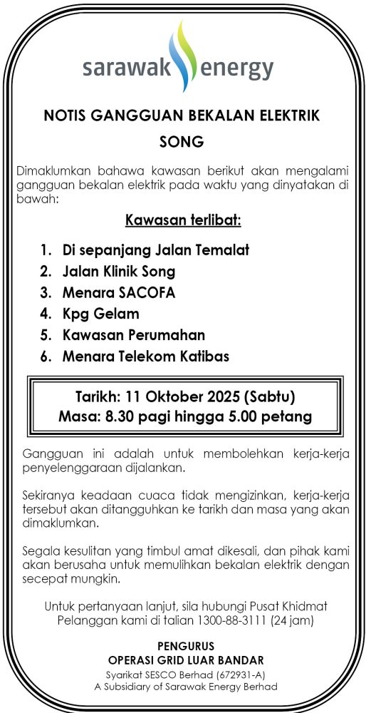 IKLAN Jumaat, 10-11 Oktober 2025, SEB, Notis Gangguan Bekalan Elektrik Song Utusan Sarawak 16 hours ago Continue Reading Previous: Jumaat, 10-11 Oktober 2025, SEB, Notis Gangguan Bekalan Elektrik Miri-SepupokNext: Jumaat, 10-11 Oktober 2025, SEB, Notis Gangguan Bekalan Elektrik Miri-Piasau