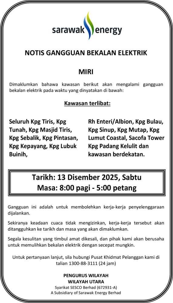 IKLAN Jumaat, 12-13 Disember 2025, SEB Notis Gangguan Bekalan Elektrik Miri Utusan Sarawak 8 hours ago Continue Reading Previous: Khamis, 11-12 Disember 2025, SEB Notis Gangguan Bekalan Elektrik Miri (Jln Taman Piasau)Next: Jumaat, 12 Disember 2025, Majlis Daerah Marudi, Kenyataan Tender (Ralat)
