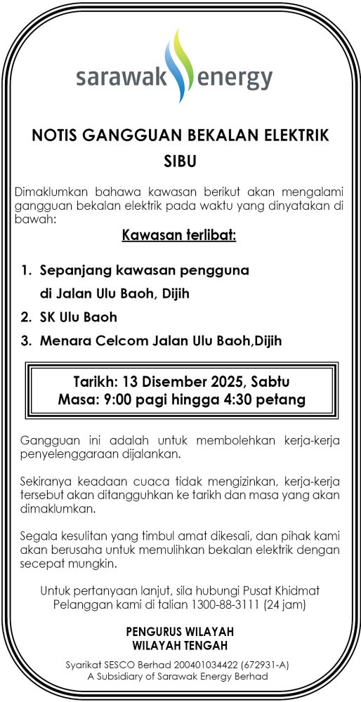 IKLAN Jumaat, 12-13 Disember 2025, SEB Notis Gangguan Bekalan Sibu (Jalan Ulu Baoh, Dijih) Utusan Sarawak 7 hours ago Continue Reading Previous: Jumaat, 12-13 Disember 2025, SEB Notis Gangguan Bekalan Elektrik Miri (Taman Piasau)Next: Jumaat, 12-13 Disember 2025, SEB Notis Gangguan Bekalan Elektrik Sarikei