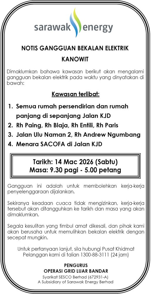 IKLAN Jumaat, 13-14 Mac 2026, SEB Notis Gangguan Bekalan Elektrik Kanowit Utusan Sarawak 6 hours ago Continue Reading Previous: Selasa, 10 Mac 2026, Majlis Bandaraya Kuching Selatan, Council Of The City Of Kuching South, Notis SebuthargaNext: Jumaat, 13-14 Mac 2026, SEB Notis Gangguan Bekalan Elektrik Miri (Sg Rait)