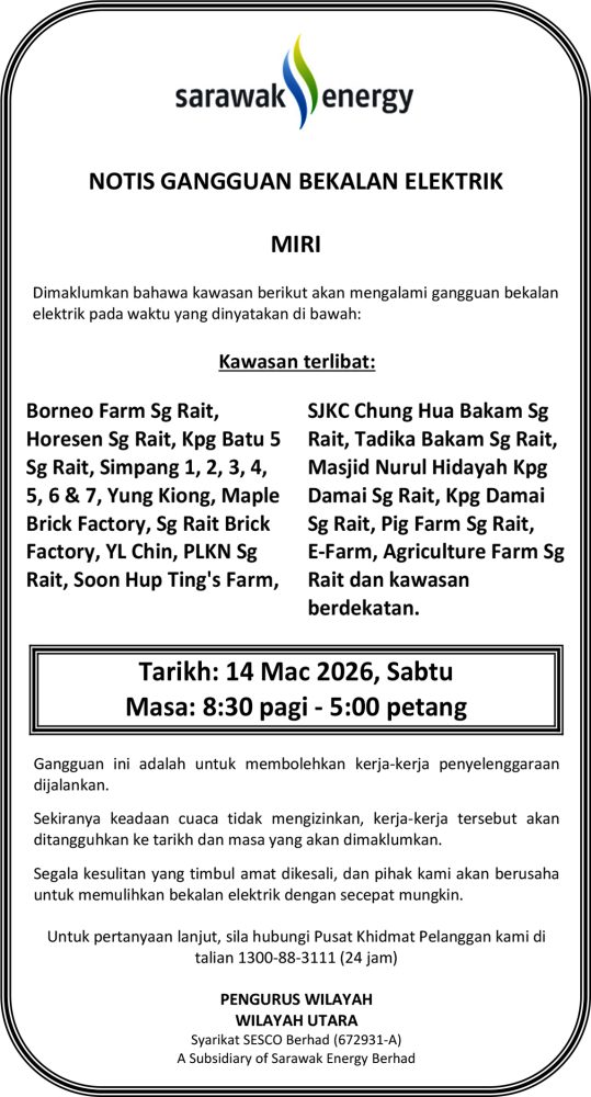 IKLAN Jumaat, 13-14 Mac 2026, SEB Notis Gangguan Bekalan Elektrik Miri (Sg Rait) Utusan Sarawak 5 hours ago Continue Reading Previous: Jumaat, 13-14 Mac 2026, SEB Notis Gangguan Bekalan Elektrik KanowitNext: Jumaat, 13-14 Mac 2026, SEB Notis Gangguan Bekalan Elektrik Kapit