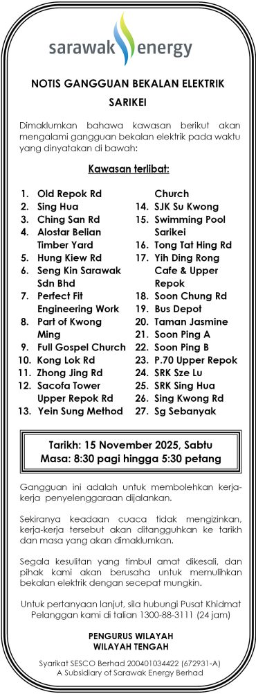IKLAN Jumaat, 14-15 November 2025, SEB Notis Gangguan Bekalan Elektrik Sarikei Utusan Sarawak 5 hours ago Continue Reading Previous: Jumaat, 14-15 November 2025, SEB Notis Gangguan Bekalan Elektrik Serian