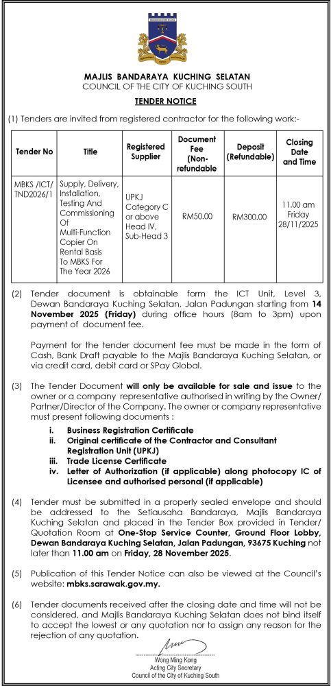 IKLAN Jumaat, 14 November 2025, MBKS,Tender Notice Utusan Sarawak 4 hours ago Continue Reading Previous: Jumaat, 14-15 November 2025, SEB Notis Gangguan Bekalan Elektrik KanowitNext: Jumaat, 14-15 November 2025, SEB Notis Gangguan Bekalan Elektrik Serian