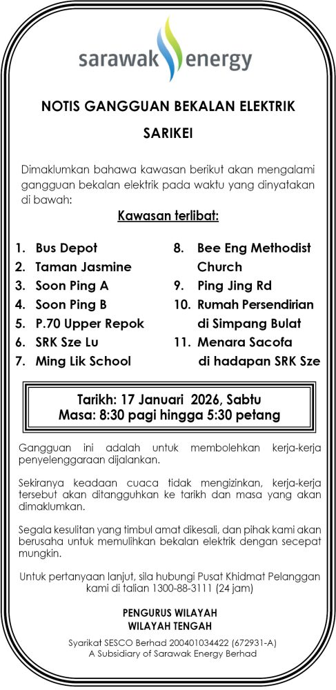 IKLAN Jumaat 16-17 Januari 2026, SEB Notis Gangguan Bekalan Elektrik Sarikei Utusan Sarawak 4 hours ago Continue Reading Previous: Jumaat, 16 Januari 2026, Majlis Daerah Subis, Kenyataan Tender Semula