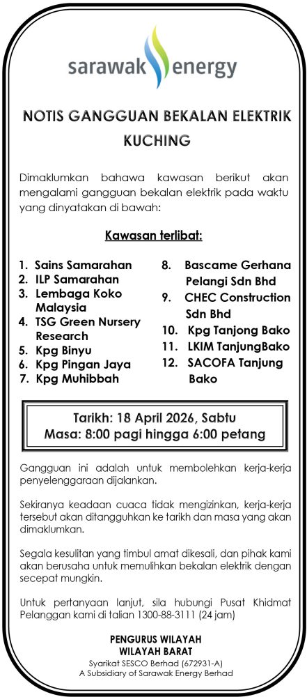 IKLAN Jumaat, 17-18 April 2026, SEB Notis Gangguan Bekalan Elektrik Kuching Utusan Sarawak 5 hours ago Continue Reading Previous: Jumaat, 17-18 April 2026, SEB Notis Gangguan Bekalan Elektrik SelangauNext: Jumaat, 17-18 April, 2026 SEB Notis Gangguan Bekalan Elektrik Julau