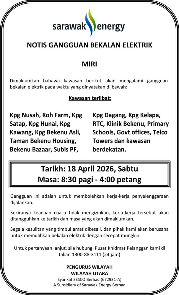 IKLAN Jumaat, 17-18 April 2026, SEB Notis Gangguan Bekalan Elektrik Miri (Bekenu) Utusan Sarawak 6 hours ago Continue Reading Previous: Jumaat, 17-18 April 2026, SEB Notis Gangguan Bekalan Elektrik Miri (Jln Cahaya)Next: Jumaat, 17-18 April 2026, SEB Notis Gangguan Bekalan Elektrik Selangau
