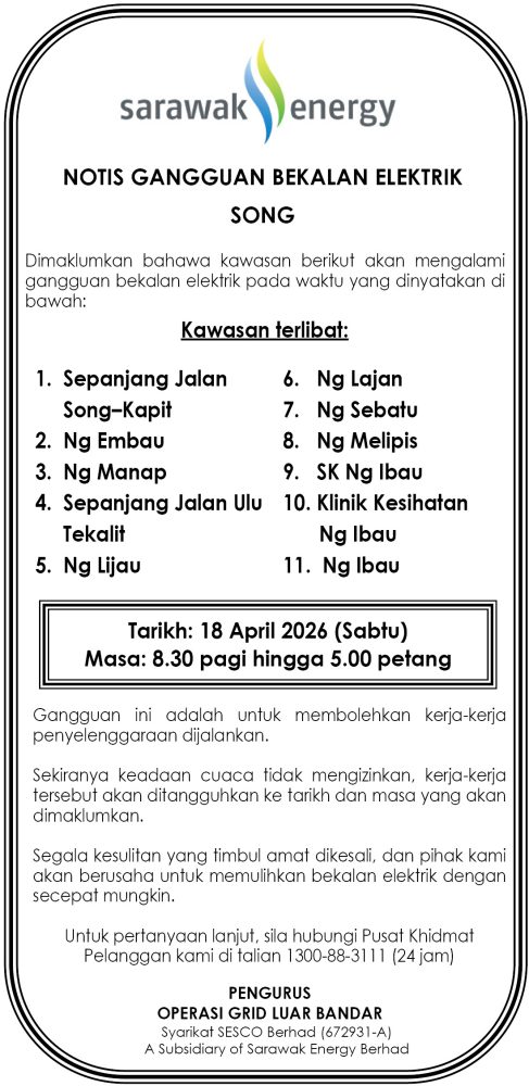 IKLAN Jumaat, 17-18 April 2026, SEB Notis Gangguan Bekalan Elektrik Song Utusan Sarawak 5 hours ago Continue Reading Previous: Jumaat, 17-18 April, 2026 SEB Notis Gangguan Bekalan Elektrik Julau
