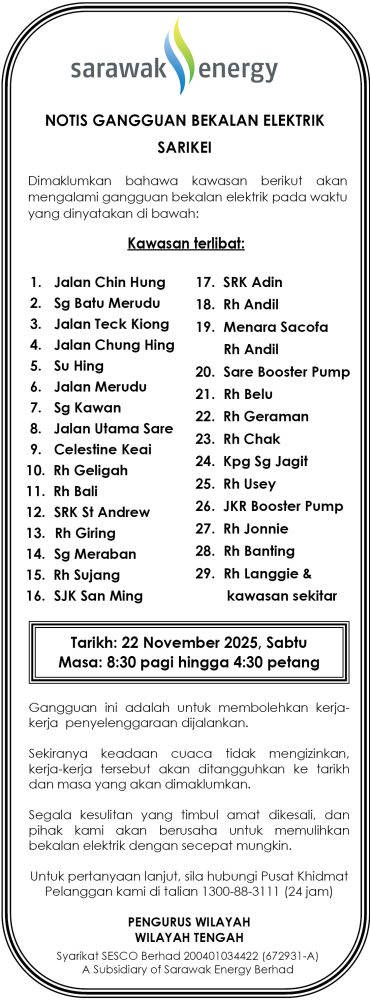 IKLAN Jumaat, 21-22 November 2025, SEB Notis Gangguan Bekalan Elektrik Sarikei Utusan Sarawak 4 hours ago Continue Reading Previous: Jumaat, 21-22 November 2025, SEB Notis Gangguan Bekalan Elektrik Sibu