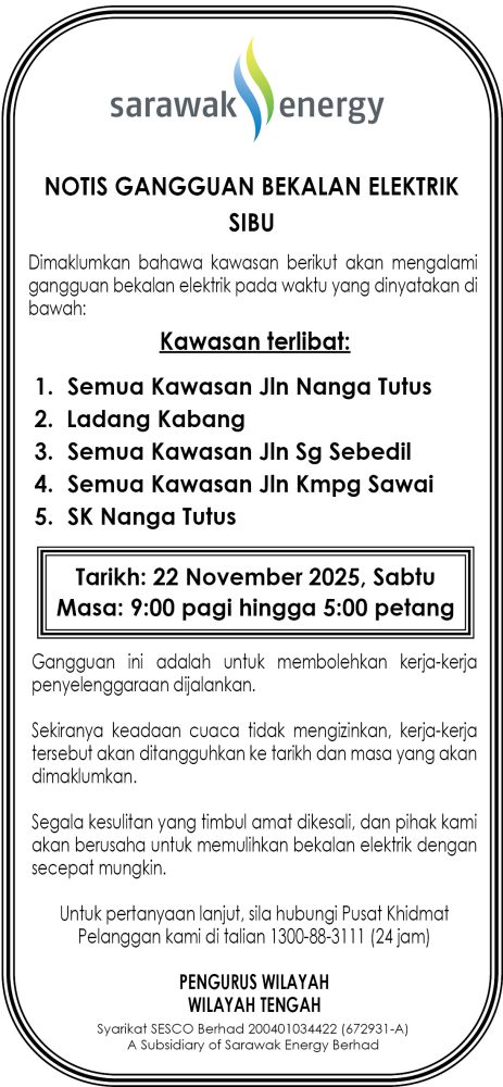 IKLAN Jumaat, 21-22 November 2025, SEB Notis Gangguan Bekalan Elektrik Sibu (Jln Nanga Tutus) Utusan Sarawak 3 hours ago Continue Reading Previous: Jumaat, 21-22 November 2025, SEB Notis Gangguan Bekalan Elektrik Miri (Pujut)Next: Jumaat, 21-22 November 2025, SEB Notis Gangguan Bekalan Elektrik Miri (Kuala Baram)