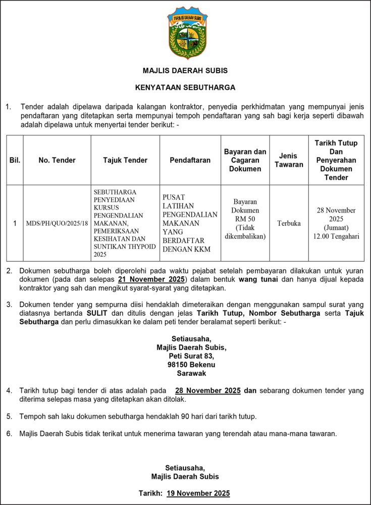 IKLAN Jumaat, 21 November 2025, Majlis Daerah Subis, Kenyatan Sebutharga Utusan Sarawak 2 hours ago Continue Reading Previous: Jumaat, 21-22 November 2025, SEB Notis Gangguan Bekalan Elektrik Miri (Bakong)Next: Jumaat, 21-22 November 2025, SEB Notis Gangguan Bekalan Elektrik Miri (Pujut)