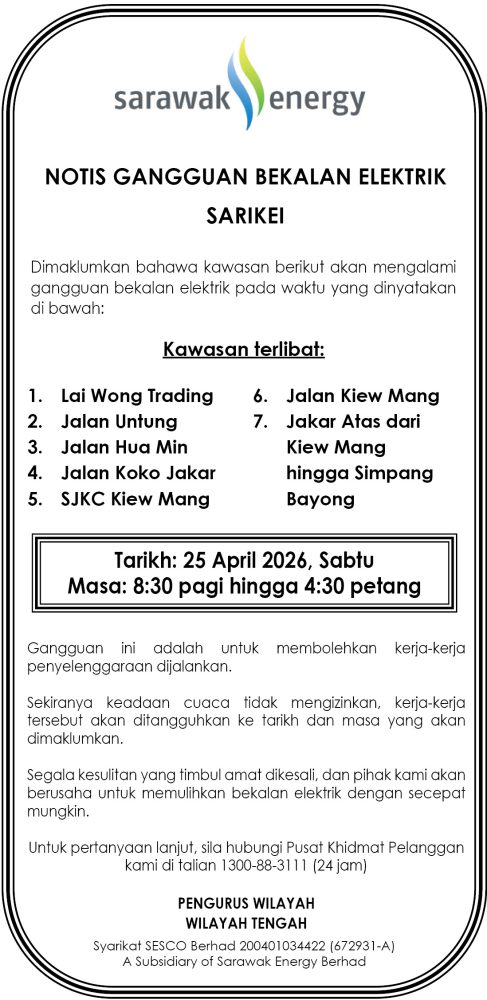 IKLAN Jumaat, 24-25 April 2026, SEB Notis Gangguan Bekalan Elektrik Sarikei Utusan Sarawak 6 hours ago Continue Reading Previous: Jumaat, 24-25 April 2026, SEB Notis Gangguan Bekalan Elektrik Sibu (Sg Assan)