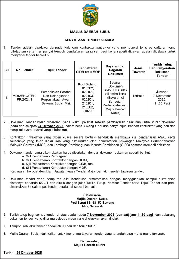 IKLAN Jumaat, 24 Oktober 2025, Majlis Daerah Subis, Kenyataan Tender Semula Utusan Sarawak 2 days ago Continue Reading Previous: Jumaat, 24-25 Oktober 2025, SEB Notis Gangguan Bekalan Elektrik KuchingNext: Jumaat, 24-25 Oktober 2025, SEB Notis Gangguan Bekalan Elektrik Sibu
