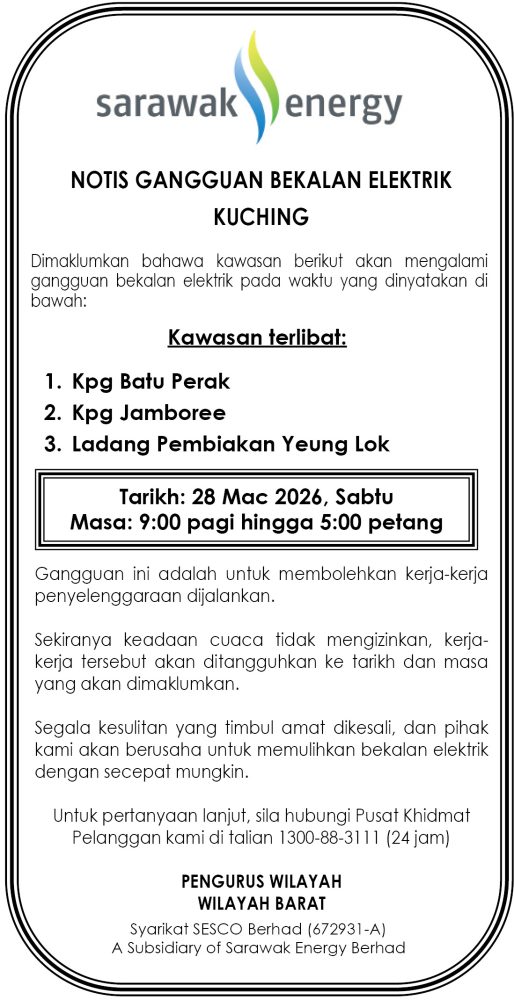 IKLAN Jumaat, 27-28 Mac 2026, SEB Notis Gangguan Bekalan Elektrik Kuching Utusan Sarawak 12 hours ago Continue Reading Previous: Jumaat, 27 Mac 2026, Bintulu Port Holdings Berhad, Insurance Tender Notice