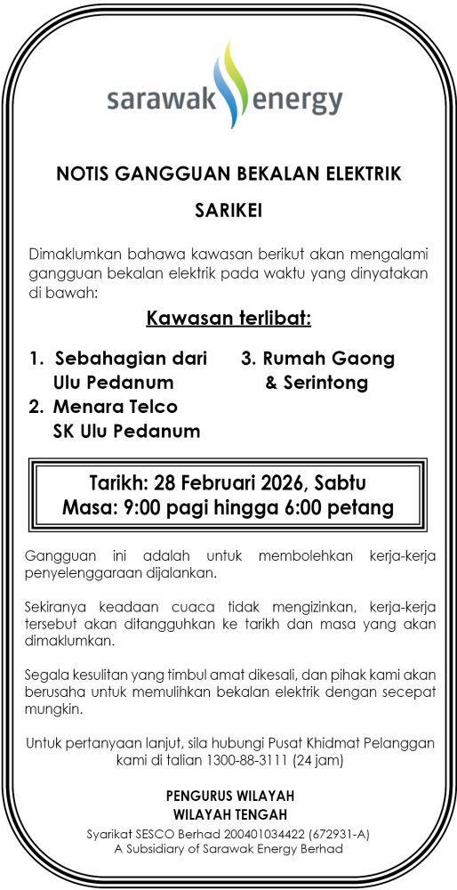 IKLAN Jumaat, 27-28 Februari 2026, SEB Notis Gangguan Bekalan Elektrik Sarikei Utusan Sarawak 6 hours ago Continue Reading Previous: Jumaat, 27-28 Februari 2026, SEB Notis Gangguan Bekalan Elektrik SibuNext: Jumaat, 27-28 Februari 2026, SEB Notis Gangguan Bekalan Elektrik Kapit