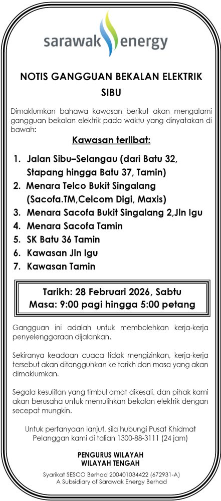 IKLAN Jumaat, 27-28 Februari 2026, SEB Notis Gangguan Bekalan Elektrik Sibu Utusan Sarawak 7 hours ago Continue Reading Previous: Kami mencari wartawan untuk kawasan Bintulu. Apakah anda berminat?Next: Jumaat, 27-28 Februari 2026, SEB Notis Gangguan Bekalan Elektrik Sarikei