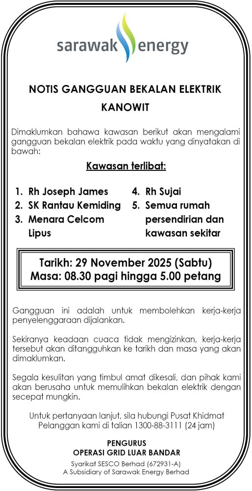 IKLAN Jumaat, 28-29 November 2025, SEB Notis Gangguan Bekalan Elektrik Kanowit Utusan Sarawak 1 hour ago Continue Reading Previous: Jumaat, 28-29 November 2025, SEB Notis Gangguan Bekalan Elektrik Julau