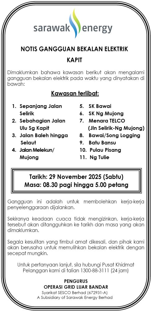 IKLAN Jumaat, 28-29 November 2025, SEB Notis Gangguan Bekalan Elektrik Kapit Utusan Sarawak 3 hours ago Continue Reading Previous: Jumaat, 28-29 November 2025, SEB Notis Gangguan Bekalan Elektrik Miri (Riam)Next: Jumaat, 28-29 November 2025, SEB Notis Gangguan Bekalan Elektrik Miri (Jln Riam Willow)