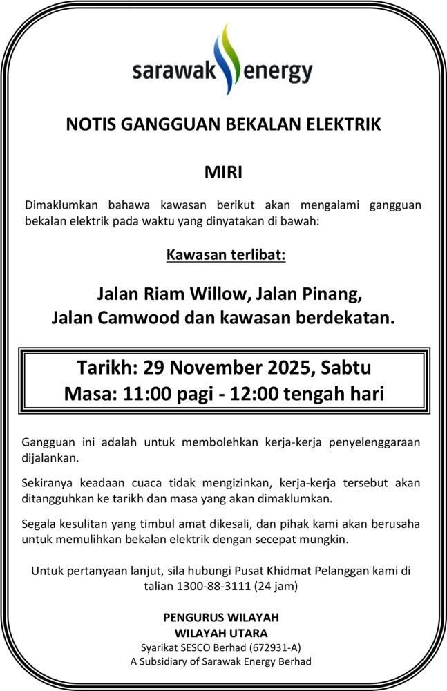 IKLAN Jumaat, 28-29 November 2025, SEB Notis Gangguan Bekalan Elektrik Miri (Jln Riam Willow) Utusan Sarawak 3 hours ago Continue Reading Previous: Jumaat, 28-29 November 2025, SEB Notis Gangguan Bekalan Elektrik KapitNext: Jumaat, 28-29 November 2025, SEB Notis Ganggun Bekalan Elektrik Miri (Da Sing Sub)