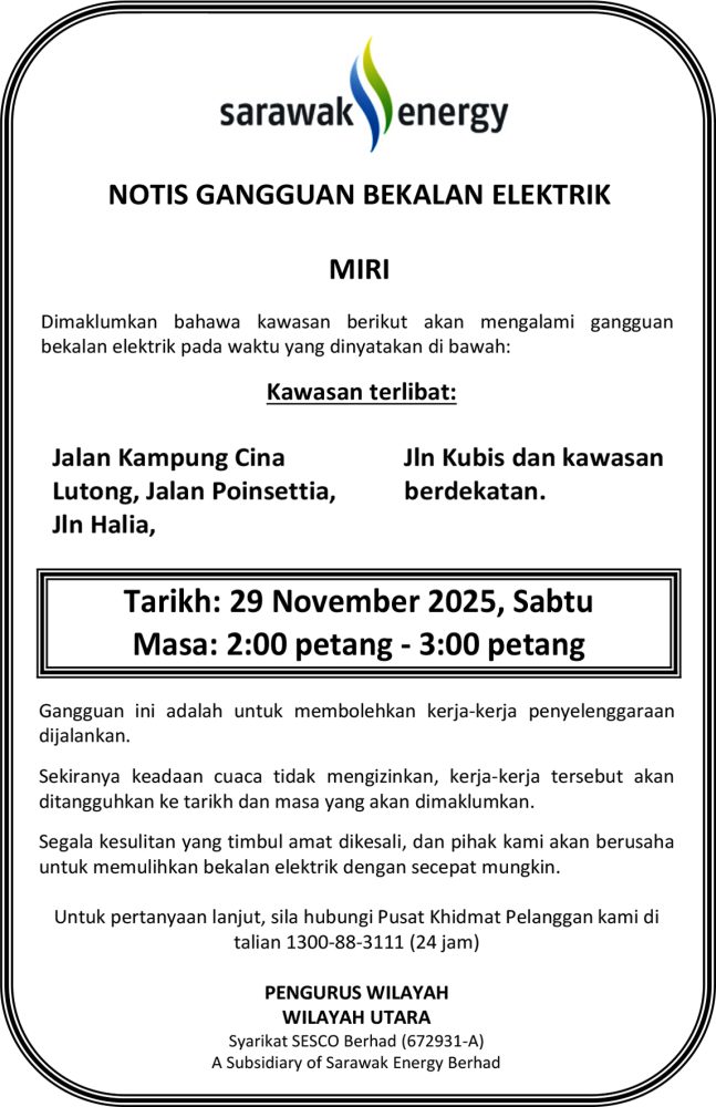 IKLAN Jumaat, 28-29 November 2025, SEB Notis Gangguan Bekalan Elektrik Miri (Lutong) Utusan Sarawak 2 hours ago Continue Reading Previous: Jumaat, 28-29 November 2025, SEB Notis Ganggun Bekalan Elektrik Miri (Da Sing Sub)Next: Jumaat, 28-29 November 2025, SEB Notis Gangguan Bekalan Elektrik Julau