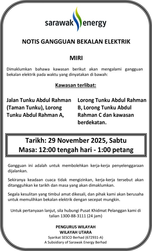 IKLAN Jumaat, 28-29 November 2025, SEB Notis Ganggun Bekalan Elektrik Miri (Da Sing Sub) Utusan Sarawak 2 hours ago Continue Reading Previous: Jumaat, 28-29 November 2025, SEB Notis Gangguan Bekalan Elektrik Miri (Jln Riam Willow)Next: Jumaat, 28-29 November 2025, SEB Notis Gangguan Bekalan Elektrik Miri (Lutong)