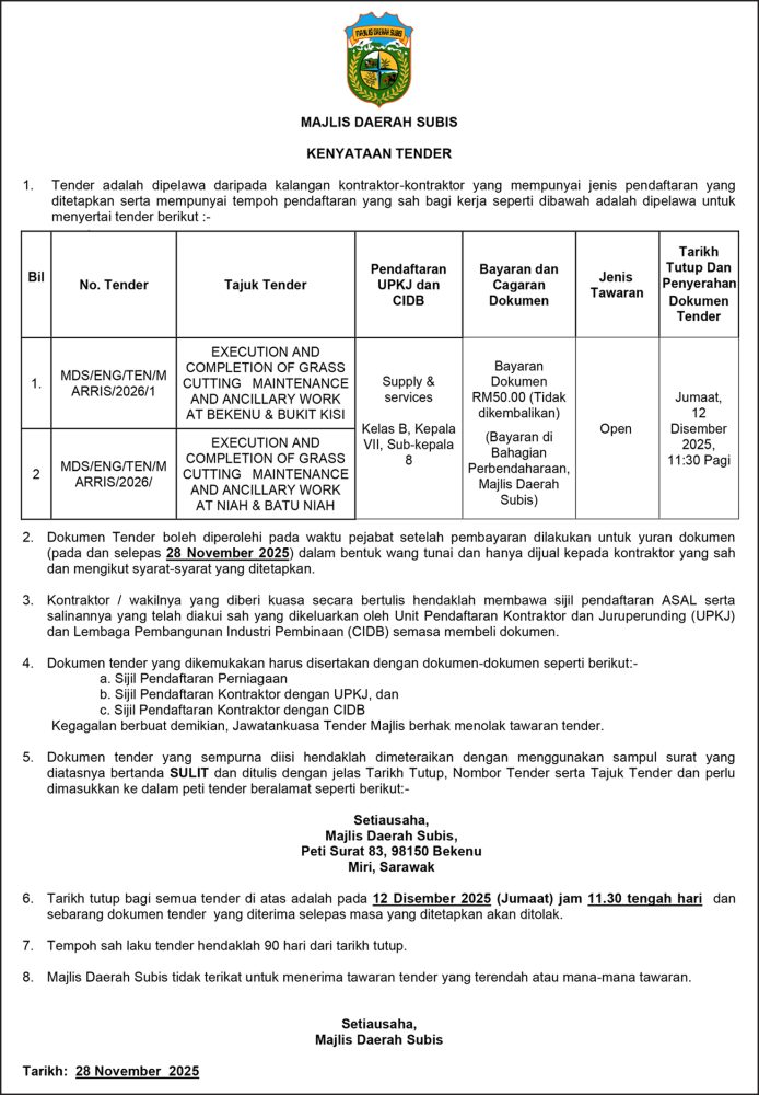 IKLAN Jumaat, 28 November 2025, Majlis Daerah Subis, Kenyataan Tender Utusan Sarawak 5 hours ago Continue Reading Previous: Khamis, 27-28 November 2025, SEB Notis Gangguan Bekalan Elektrik Miri (Hill Top)Next: Jumaat, 28-29 November 2025, SEB Notis Gangguan Bekalan Elektrik Miri (Piasau Beach)