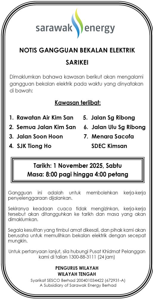 IKLAN Jumaat, 31 Oktober – 1 November 2025, SEB Notis Gangguan Bekalan Elektrik Sarikei Aik Kim San Utusan Sarawak 5 hours ago Continue Reading Previous: Jumaat, 31 Oktober – 1 November 2025, SEB Notis Gangguan Bekalan Elektrik Sibu-SelangauNext: Jumaat, 31 Oktober-1 November 2025, SEB Notis Gangguan Bekalan Elektrik Sibu