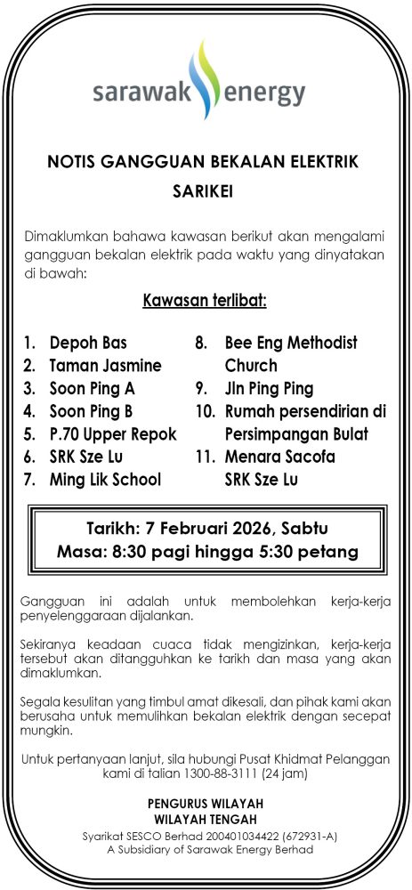 IKLAN Jumaat, 6-7 Februari 2026, SEB Notis Gangguan Bekalan Elektrik Sarikei Utusan Sarawak 4 hours ago Continue Reading Previous: Jumaat, 6-7 Februari 2026, SEB Notis Gangguan Bekalan Elektrik Sibu (Sg Assan)