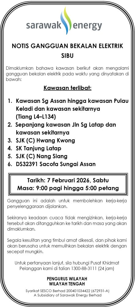 IKLAN Jumaat, 6-7 Februari 2026, SEB Notis Gangguan Bekalan Elektrik Sibu (Sg Assan) Utusan Sarawak 6 hours ago Continue Reading Previous: Jumaat, 6-7 Februari 2026, SEB Notis Gangguan Bekalan Elektrik SibuNext: Jumaat, 6-7 Februari 2026, SEB Notis Gangguan Bekalan Elektrik Sarikei