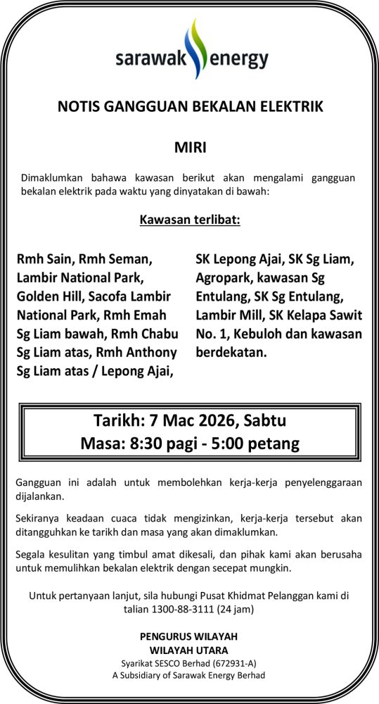 IKLAN Jumaat, 6-7 Mac 2026, SEB Notis Gangguan Bekalan Elektrik Miri (Jln Miri-Bintulu) Utusan Sarawak 8 hours ago Continue Reading Previous: Apakah anda berminat?Next: Jumaat, 6-7 Mac 2026, SEB Notis Gangguan Bekalan Elektrik Miri