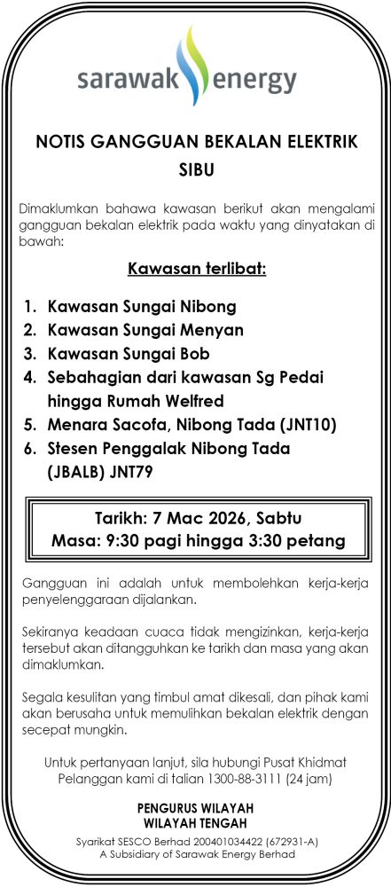 IKLAN Jumaat, 6-7 Mac 2026, SEB Notis Gangguan Bekalan Elektrik Sibu Utusan Sarawak 9 hours ago Continue Reading Previous: Jumaat, 6-7 Mac 2026, SEB Notis Gangguan Bekalan Elektrik MiriNext: Jumaat, 6-7 Mac 2026, SEB Notis Gangguan Bekalan Elektrik Sarikei