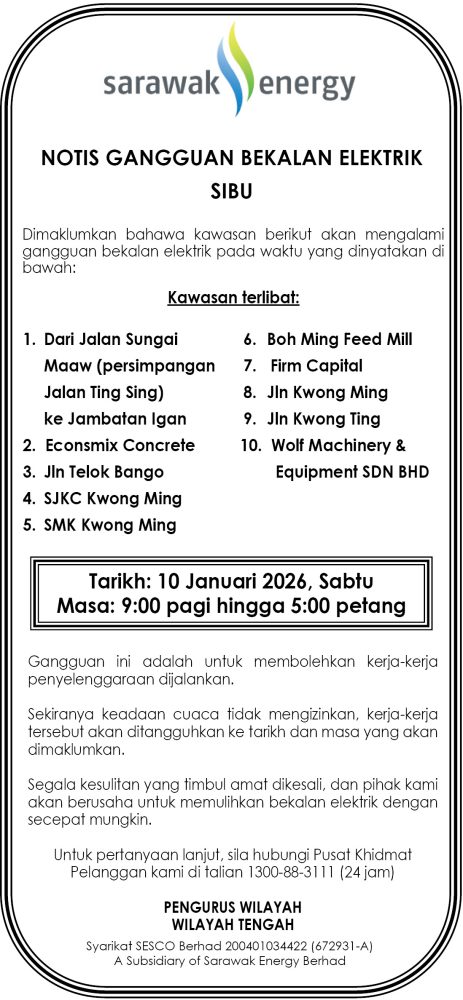 IKLAN Jumaat, 9-10 Januari 2026, SEB Notis Gangguan Bekalan Elektrik Sibu Utusan Sarawak 21 hours ago Continue Reading Previous: Jumaat, 9-10 Januari 2026, SEB Notis Gangguan Bekalan Elektrik JulauNext: Jumaat, 9-10 Januari 2026, SEB Notis Gangguan Bekalan Elektrik Kanowit
