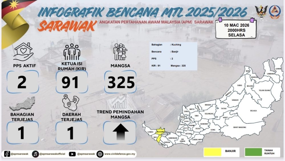 Berdasarkan laporan terkini bencana negeri Sarawak, seramai 325 mangsa daripada 91 Ketua Isi Rumah (KIR) kini ditempatkan di dua PPS yang dibuka di daerah Kuching.
