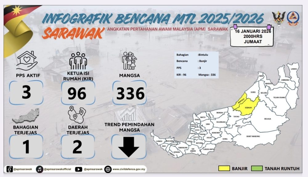 Menurut Laporan Bencana Negeri Sarawak, setakat 8.00 malam ini, sebanyak tiga PPS masih beroperasi dengan jumlah keseluruhan 96 keluarga. Trend pemindahan mangsa dilaporkan menunjukkan penurunan.