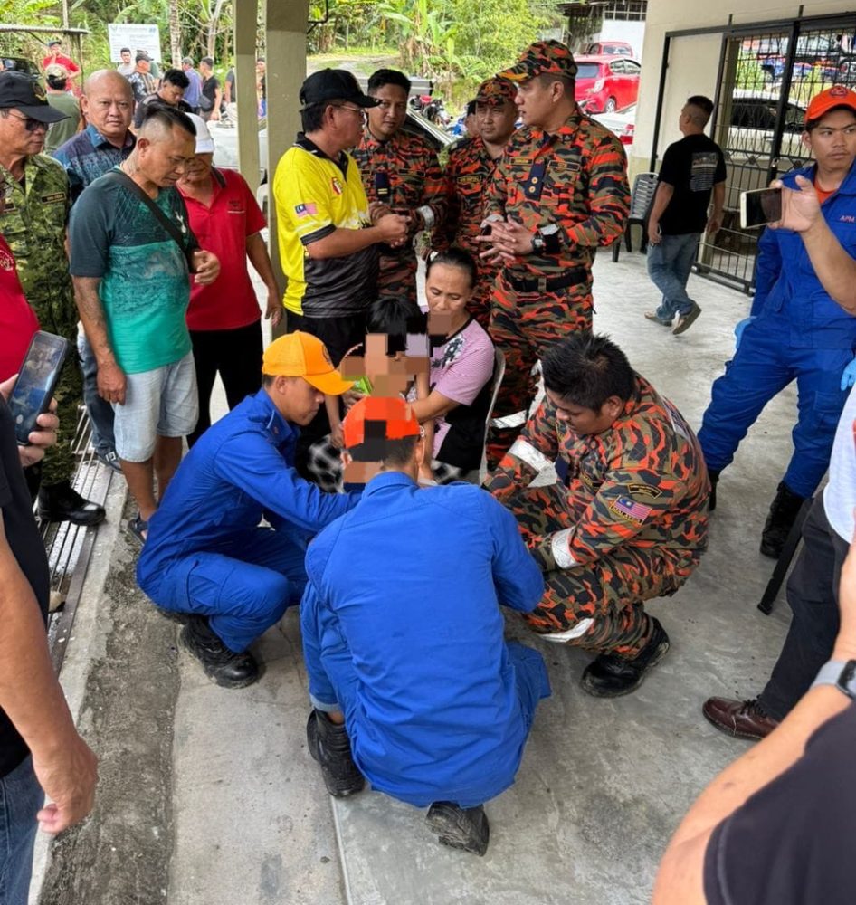 SELAMAT… Anggota Jabatan Bomba dan Penyelamat Malaysia (JBPM) Sarawak bersama Unit EMRS memberikan rawatan awal kepada seorang kanak-kanak orang kurang upaya yang ditemui selamat semalam selepas dilaporkan hilang di Kampung Tembawang Sauh, Bau, hasil operasi mencari dan menyelamat (SAR) melibatkan pelbagai agensi. Foto JBPM