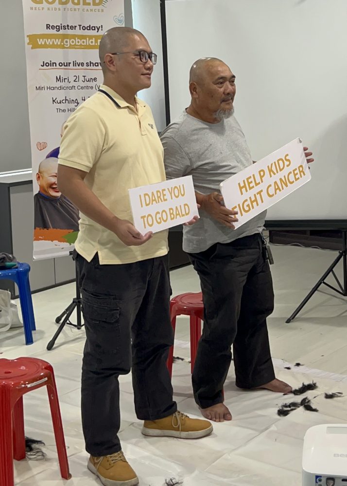 ORAI Goper (kanan) dan Fidelis George (kiri) mencukur rambut sebagai tanda solidariti dalam menyokong kanak-kanak pesakit kanser sempena pelancaran GoBald 2026 di Pejabat SCCS, semalam. Foto Adele Rissa