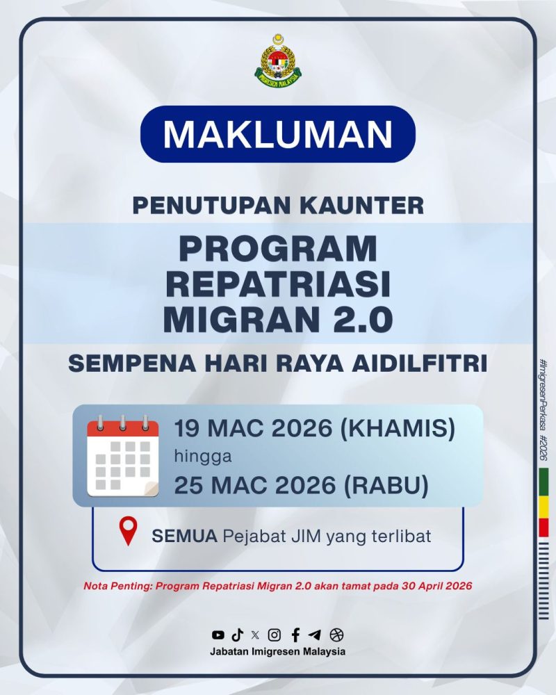 “Nota penting: Program Repatriasi Migran 2.0 akan tamat pada 30 April 2026,” menurut hantaran itu.