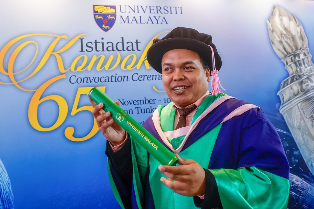 “Untuk menulis, saya boleh menggunakan Microsoft dan perisian, tetapi bahagian teknikal seperti nota kaki dan bibliografi memerlukan ketelitian. Di situlah isteri saya banyak membantu,” katanya kepada pemberita selepas menerima Ijazah Doktor Falsafah pada Istiadat Konvokesyen UM ke-65 semalam.