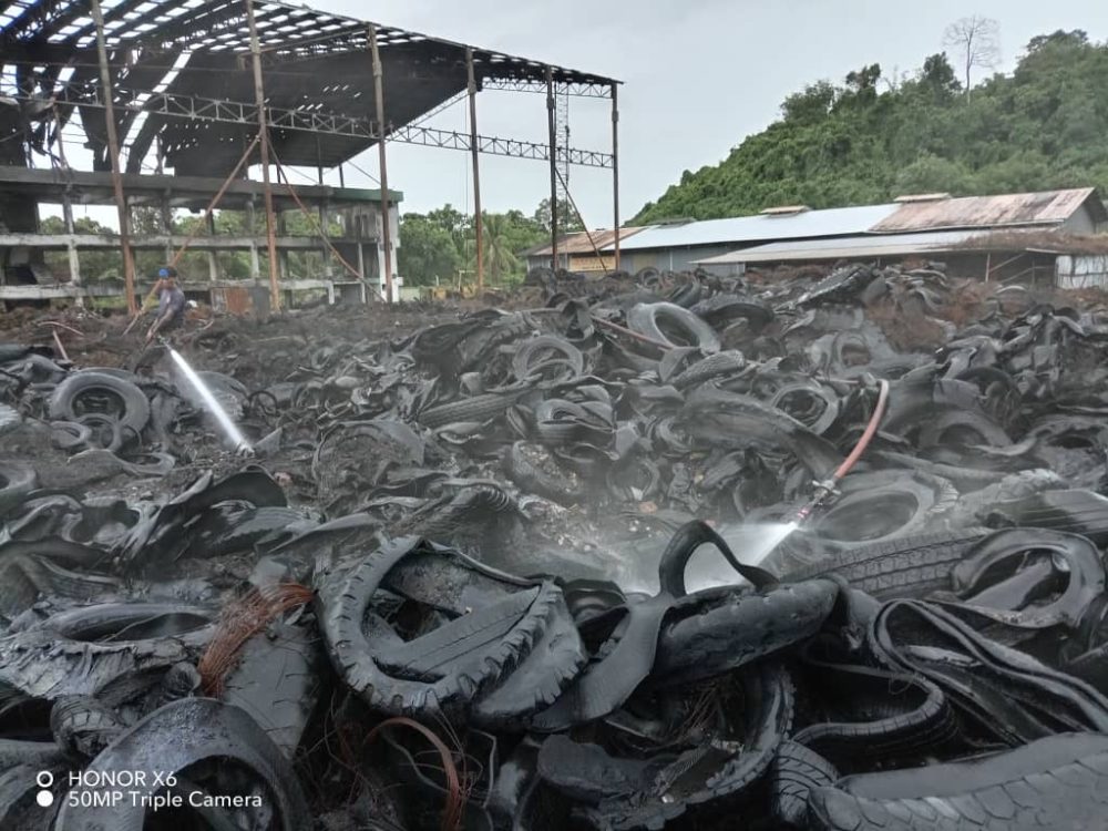 KUCHING: Satu kebakaran semula berlaku pada longgokan tayar di Batu 9, Lorong Green Wood, di sini, membabitkan timbunan tayar yang terletak di belakang sebuah kilang.