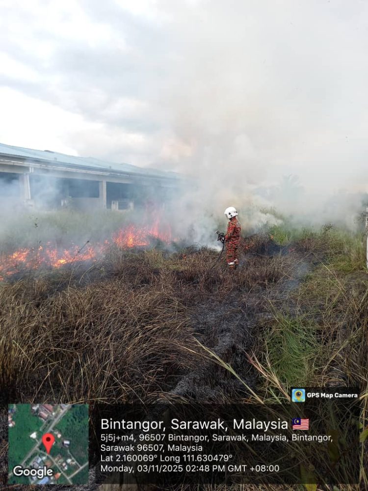 PADAM KEBAKARAN…. Anggota bomba memadam kebakaran rumput di kawasan perumahan Bukit Melot. Foto BBP Bintangor