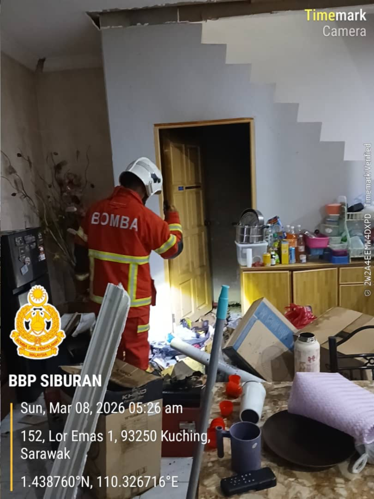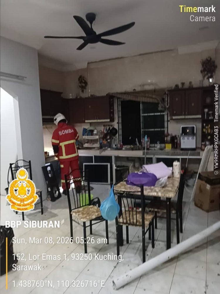 “Setibanya Pasukan Keluaran Operasi (PKO) di lokasi di Lorong 1, Taman Mas Padawan pada 5.04 pagi, didapati kebocoran gas telah menyebabkan letupan kecil dan kebakaran pada bahagian setor rumah sehingga siling ruang dapur runtuh. Api telah terpadam sendiri sebelum ketibaan anggota bomba,” katanya dalam satu kenyataan hari ini.
