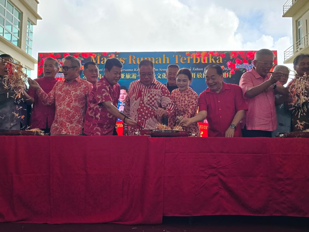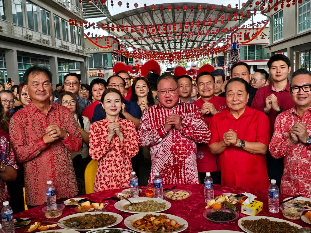 MOHON BERKAT… Menteri Pelancongan, Seni dan Budaya, Dato Sri Tiong King Sing bersama barisan tetamu kehormat menggaul Yee Sang pada majlis rumah terbuka beliau di Pulau Li Hua, hari ini. Foto Akun Giman