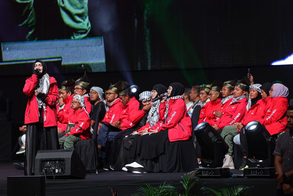 SUKARELAWAN warganegara Malaysia yang menyertai misi kemanusiaan Global Sumud Flotilla (GSF) Zizi Kirana atau nama sebenar Nur Fazelah Mad Tahil berselawat pada Himpunan Solidariti Bersama Gaza di Stadium Axiata Arena, Bukit Jalil baru-baru ini. Foto BERNAMA